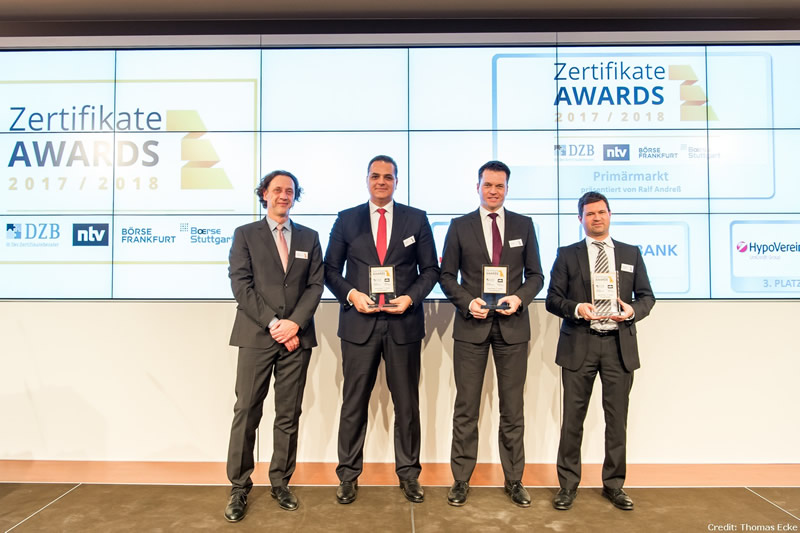 Die weiteren Platzierungen liegen denkbar nah beieinander. Es folgen gleich drei Emittenten, die auf je 32 Punkte kommen. Sowohl die DZ Bank als auch die HypoVereinsbank können dabei sogar noch die identische Anzahl von sechs Drei-Punkte-Wertungen vorweisen. Somit musste die Reihenfolge hier anhand der Zwei-Punkte-Wertungen entschieden werden. Sechs Juroren sprachen der DZ zwei Punkte zu, die somit das Rennen für sich entscheidet. Die DZ fällt als besonders verlässlicher Partner für Vertriebe auf. In einer Umfrage loben Berater explizit die starke Betreuung der Bank. Ihr Angebot ist vor allem von Expresszertifikaten geprägt, wo die DZ auch Marktführer beim Volumen ist. Ganz besonders stach im laufenden Jahr aber die Wiederaufnahme einer Idee abseits der Expresse hervor: Beim „Best of Basket“ werden drei Aktien ins Rennen geschickt, wobei sich die Rückzahlung nur an der besten orientiert.